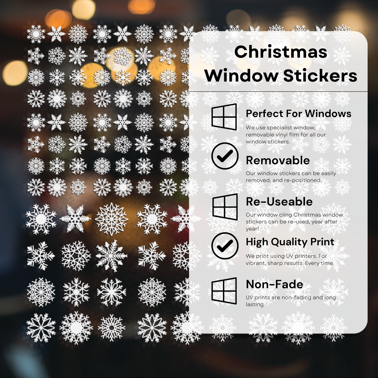 Many Christmas our window stickers are designed to be reusable. They can typically be peeled off and repositioned without losing their adhesion, allowing you to use them year after year if handled carefully. The snowflake window stickers are printed onto window cling, so are easily removable. Other Christmas window decorations we sell, are a little trickier to maintain in original condition. We recommend using a hair dryer to lightly heat the sticker, to peel off easier.