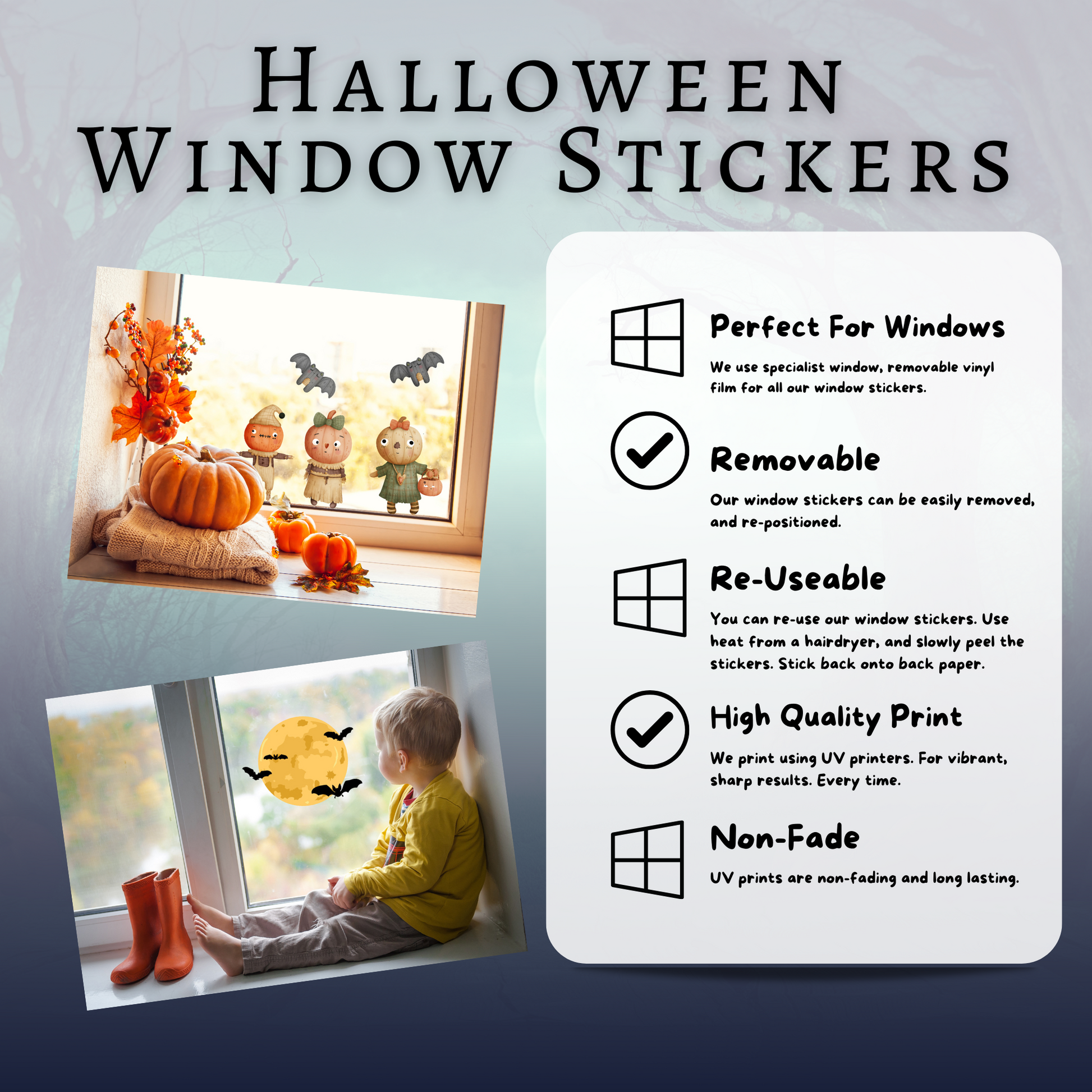 The easy way to create your perfect Halloween window! Can be removed easily and re-used, year after year. Can be viewed from the outside, and inside.